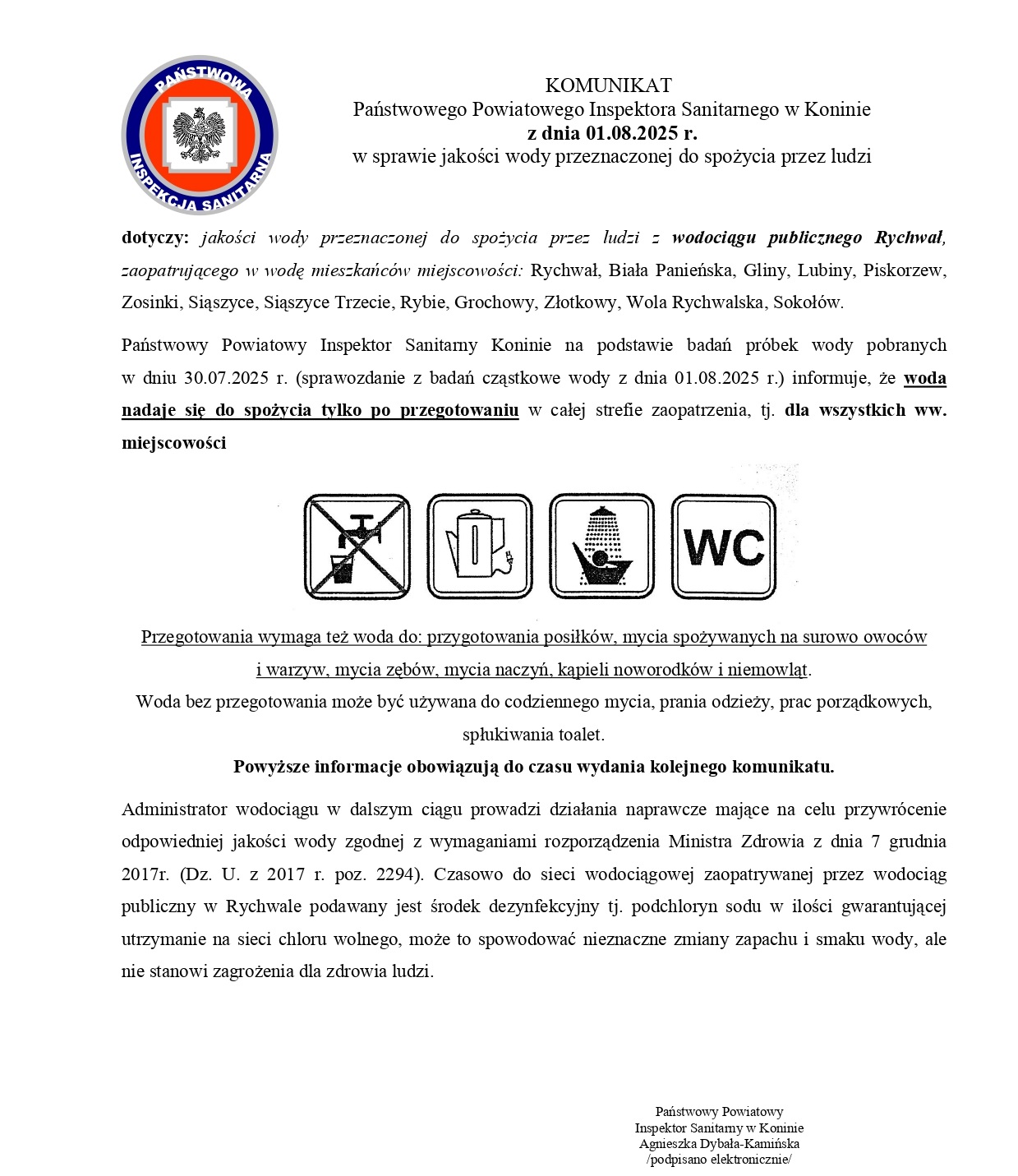Państwowy Powiatowy Inspektor Sanitarny w Koninie w komunikacie z 1 sierpnia 2025 r. poinformował, że woda z wodociągu publicznego Rychwał nadal nadaje się do spożycia wyłącznie po przegotowaniu. Dotyczy to mieszkańców miejscowości: Rychwał, Biała Panieńska, Gliny, Lubiny, Piskorzew, Zosinki, Siąszyce, Siąszyce Trzecie, Rybie, Grochowy, Złotkowy, Wola Rychwalska i Sokołów. Powodem jest obecność bakterii grupy coli wykryta w próbkach pobranych 30 lipca.