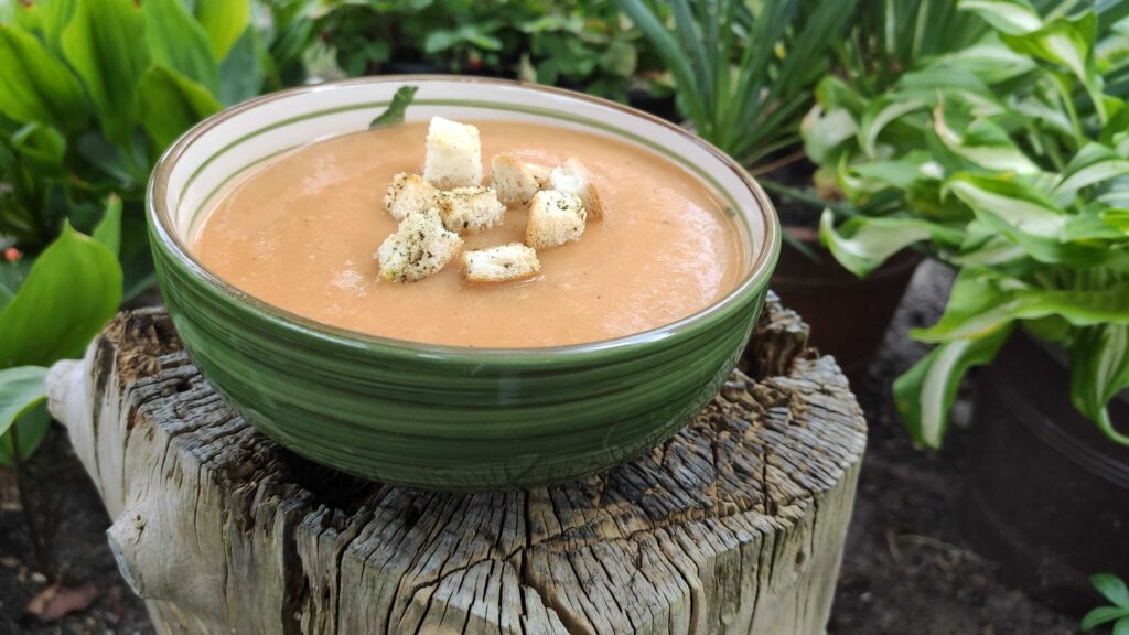 Dzięki ziemniakom zupa staje się bardziej sycąca, a pomidory nadają jej subtelnej słodyczy przełamanej odrobiną kwasowości. Podana z chrupiącymi, aromatycznymi grzankami z bułki smakuje wyjątkowo – szczególnie w chłodniejsze, jesienne wieczory.