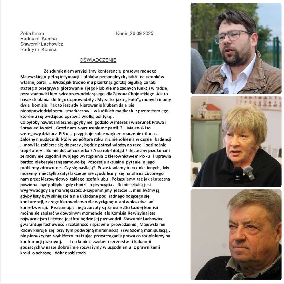 W konińskiej Radzie Miasta wybuchł jeden z najostrzejszych konfliktów tej kadencji. W centrum sporu znaleźli się radni Prawa i Sprawiedliwości – Zofia Itman i Sławomir Lachowicz oraz przewodniczący klubu PiS Krystian Majewski. Oświadczenia, briefingi prasowe i mocne słowa pokazują, że partyjne podziały w Koninie coraz mocniej wychodzą na światło dzienne.