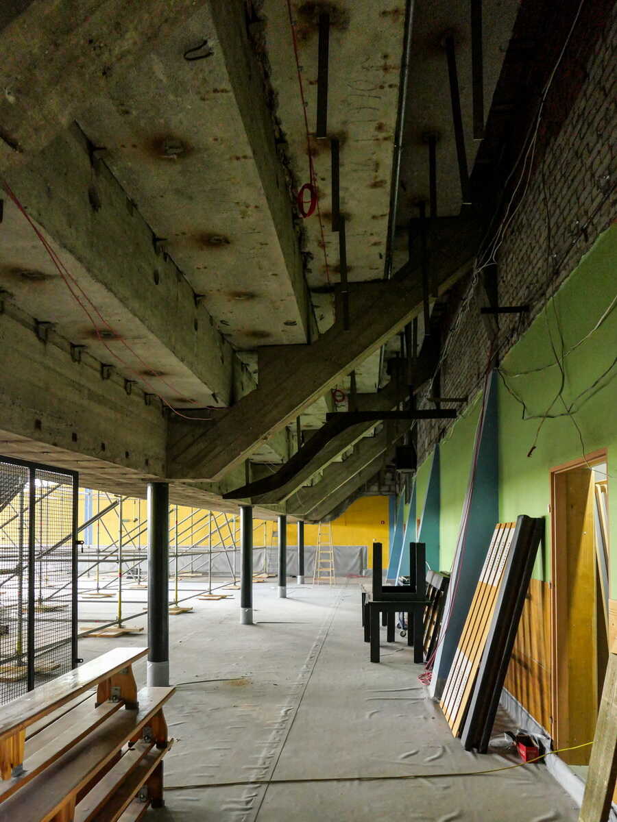 Pierwszym etapem było zdemontowanie słynnej, wszechobecnej w hali boazerii. Pod nią odkryto betonowe trybuny, które zostaną wyeksponowane i osłonięte w nowoczesny sposób – przy jednoczesnym zachowaniu oryginalnych elementów wystroju.