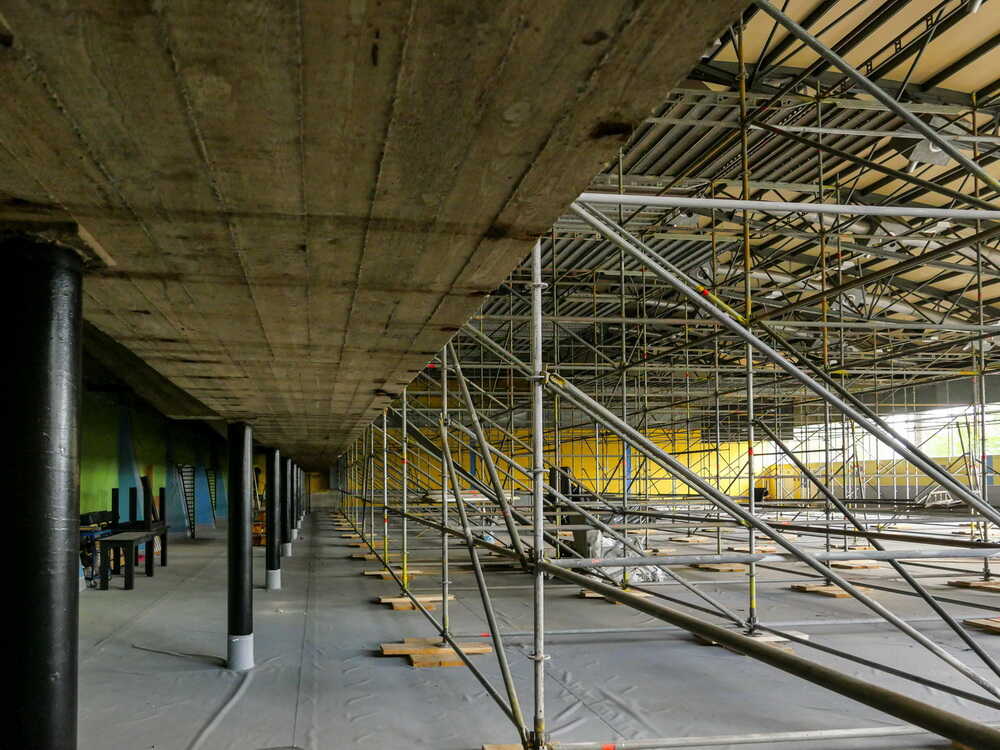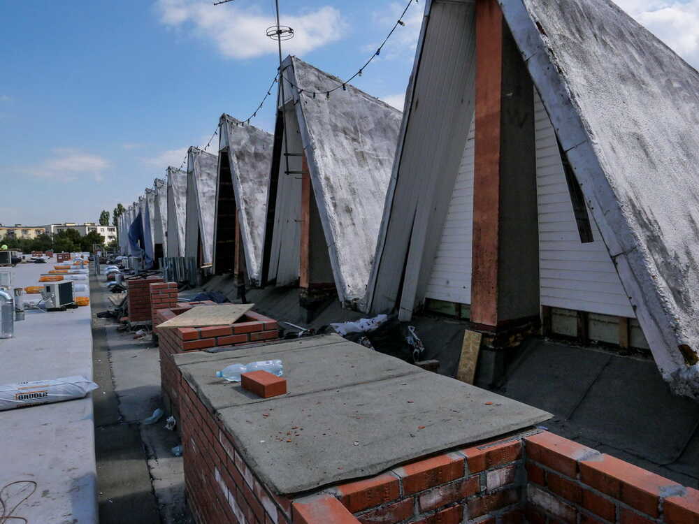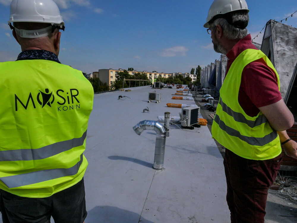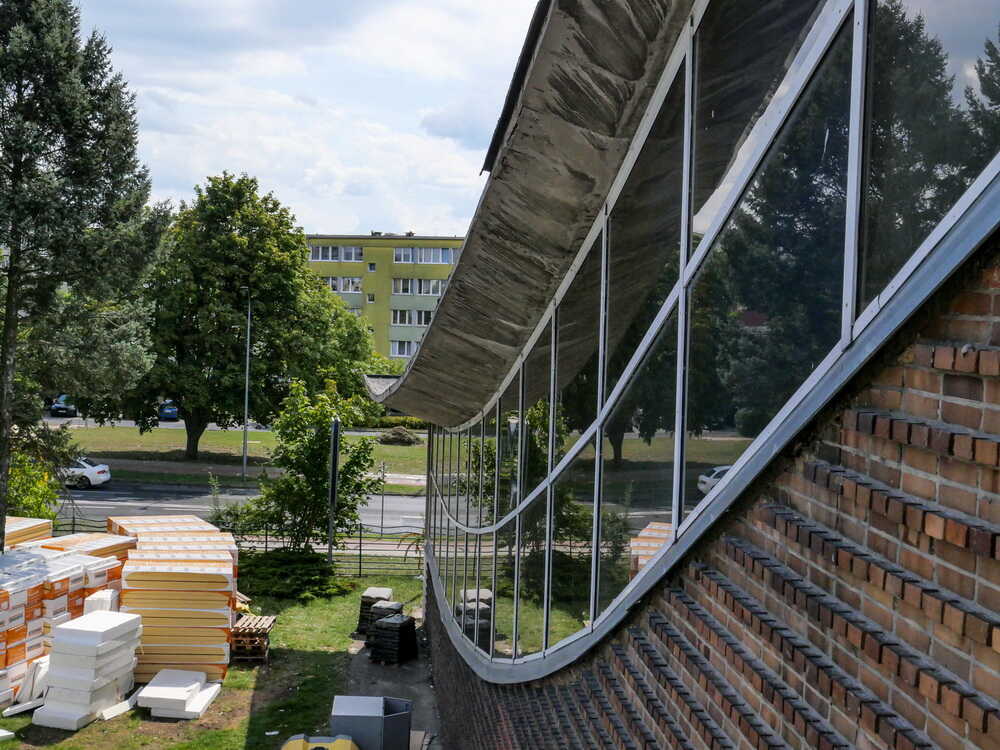 Najwięcej dzieje się na górze – na dachu. To on był największym problemem eksploatacyjnym obiektu. Stare pokrycie, składające się z kilkunastu warstw papy i różnych szczeliw, zostało usunięte. Teraz zastąpi je nowa, solidna nawierzchnia, którą można już zobaczyć od strony wejścia głównego.