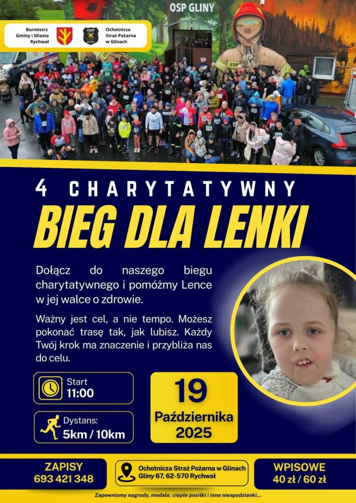 Organizatorami imprezy są Ochotnicza Straż Pożarna w Glinach oraz Burmistrz Gminy i Miasta Rychwał. Start zaplanowano na godzinę 11:00, a uczestnicy będą mogli wybrać jeden z dwóch dystansów – 5 km lub 10 km. W biegu nie liczy się tempo, lecz sam udział. Jak podkreślają organizatorzy, każdy krok ma znaczenie i przybliża Lenkę do celu.