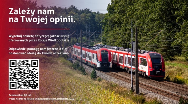Badanie obejmuje m. in. ocenę komfortu podróży, poziom zadowolenia z rozkładu jazdy, czy też obsługi w pociągu. Ankieta dostępna jest online pod adresem: https://koleje-wielkopolskie.com.pl/ankieta2025.
