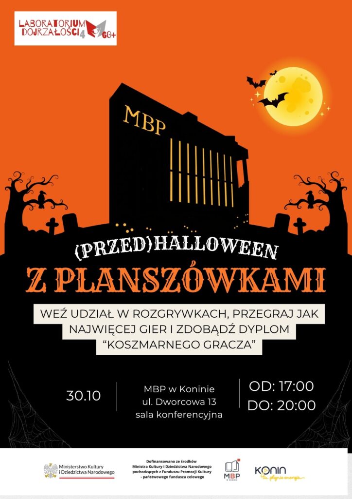 Miejska Biblioteka Publiczna im. Zofii Urbanowskiej w Koninie zaprasza wszystkich miłośników gier planszowych – od najmłodszych po najstarszych – na wyjątkowe (Przed)Halloweenowe Spotkanie z Grami Planszowymi, które odbędzie się dziś, tj. czwartek, 30 października 2025 r., w godz. 17.00–20.00. Uczestnicy spotkają się w sali konferencyjnej biblioteki przy ul. Dworcowej 13.