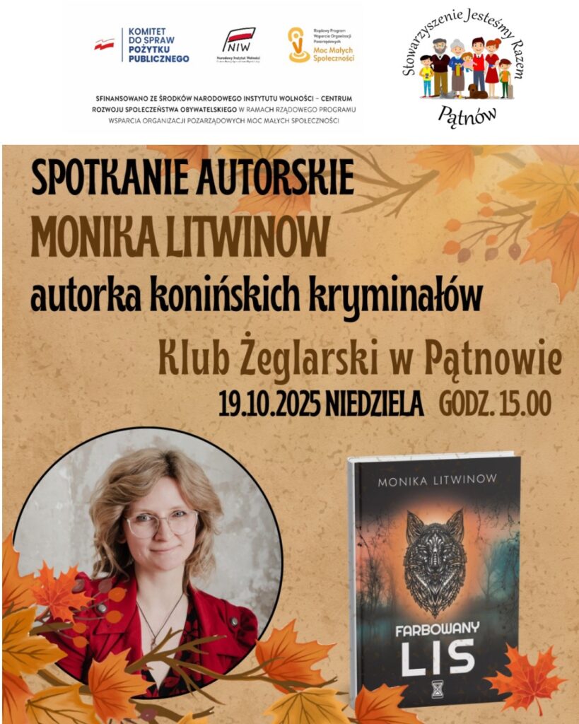 Teraz przed nami kolejne wydarzenie! Już w niedzielę, 19 października o godz. 15:00, w Klubie Żeglarskim w Pątnowie odbędzie się spotkanie autorskie z Moniką Litwinow – autorką popularnych powieści kryminalnych.