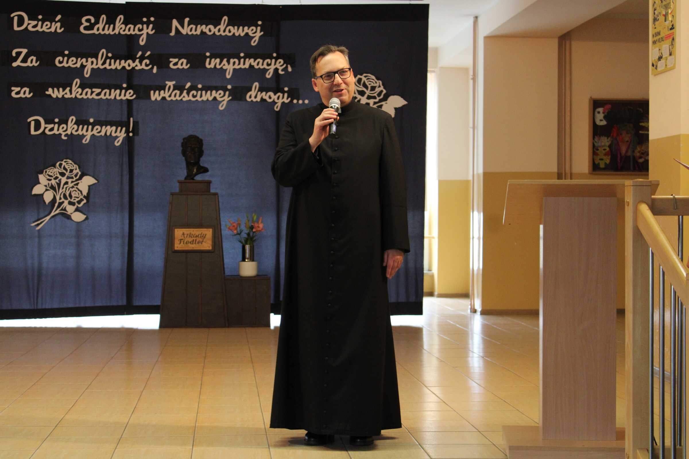 Nie zabrakło również ciepłych słów od proboszcza parafii Trójcy Świętej w Rychwale ks. Marka Molewskiego, który życzył nauczycielom siły i błogosławieństwa w pracy, a całości dodał odrobinę humoru, jak to ma w zwyczaju.