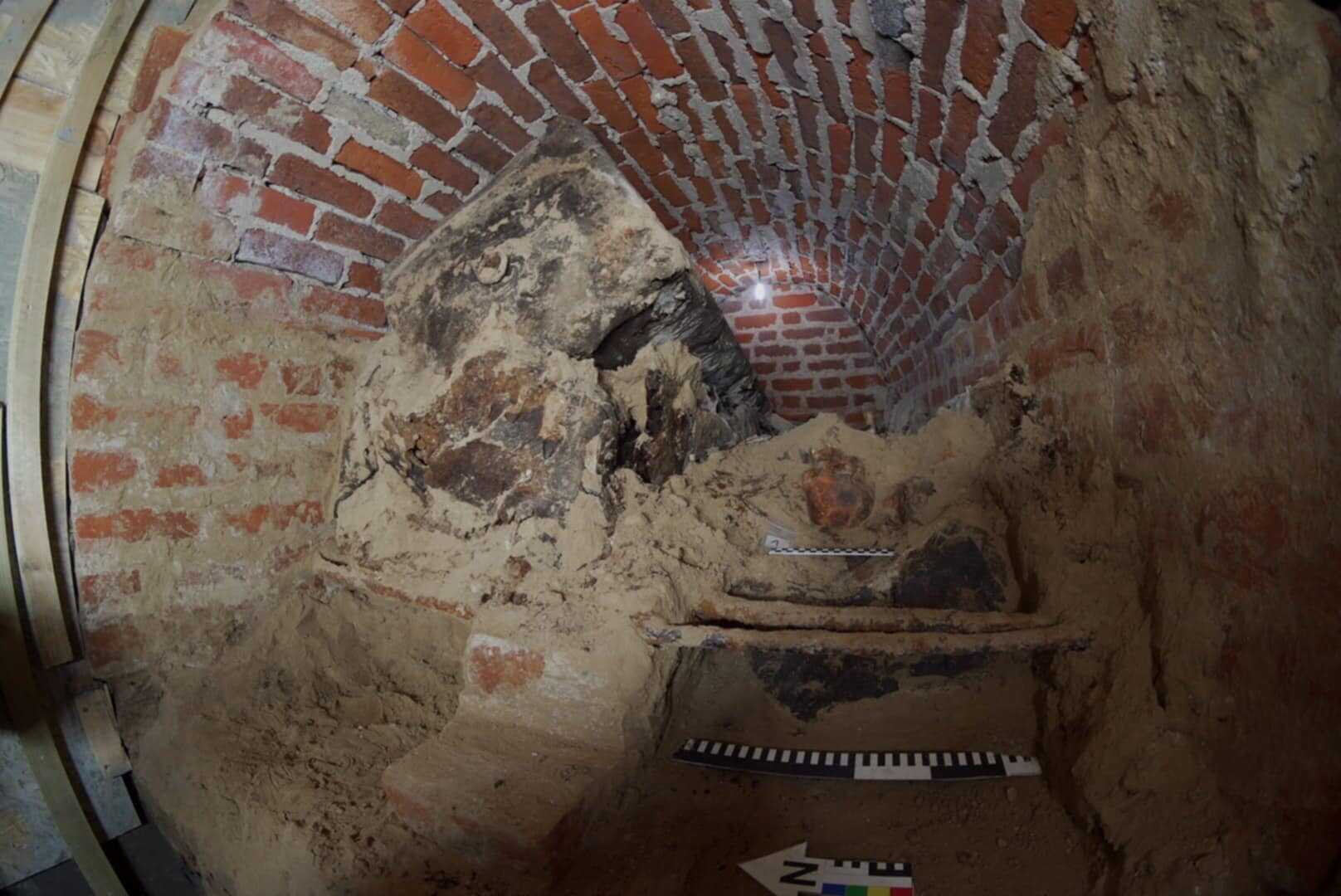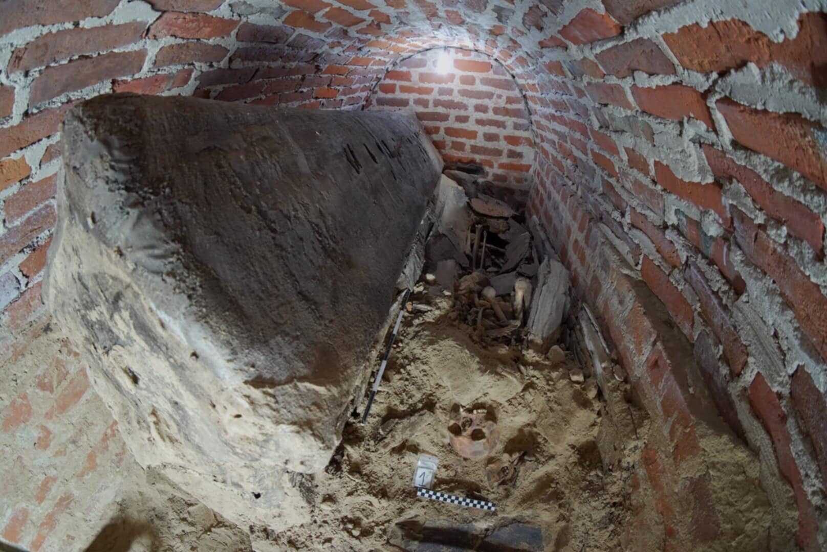 W krypcie odsłonięto trzy warstwy trumien. Najniższa z nich ustawiona była na metalowych prętach, co – jak tłumaczy prof. dr hab. Małgorzata Grupa z Uniwersytetu Mikołaja Kopernika w Toruniu – miało na celu uchronienie wcześniejszego, wyjątkowego pochówku. – Do tej pory w Polsce nie udało się tego zjawiska tak wyraźnie zarejestrować – podkreśla archeolog.