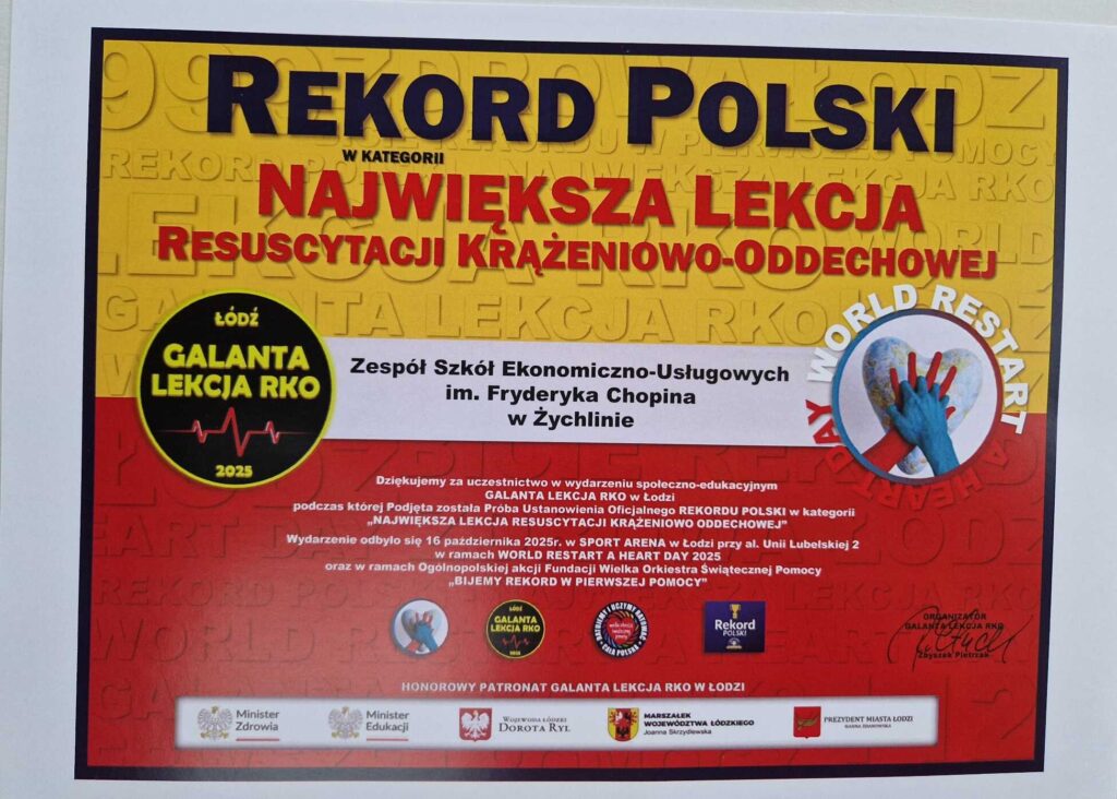 Zespół Szkół Ekonomiczno-Usługowych w Żychlinie po raz kolejny udowodnił, że nauka może iść w parze z odpowiedzialnością i troską o innych. Uczniowie tej placówki wzięli udział w ogólnopolskim biciu Rekordu Polski w największej lekcji resuscytacji krążeniowo-oddechowej (RKO), które odbyło się w łódzkiej Sport Arenie.