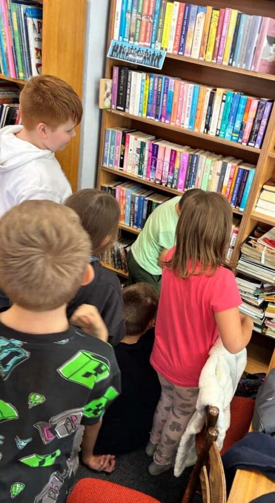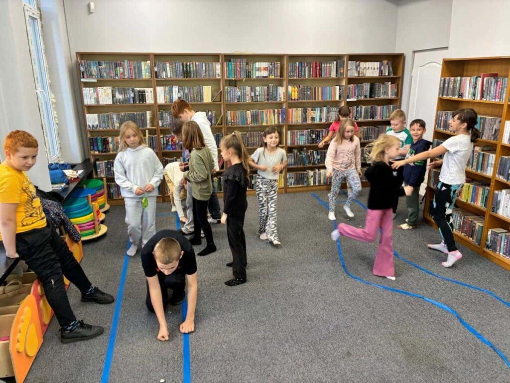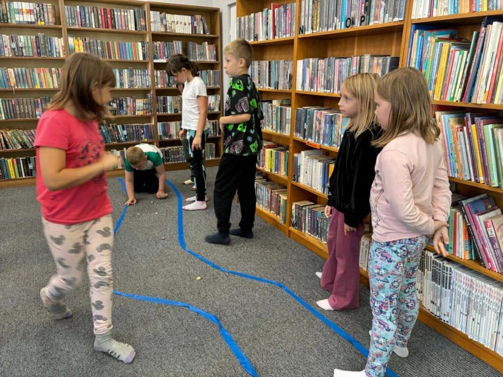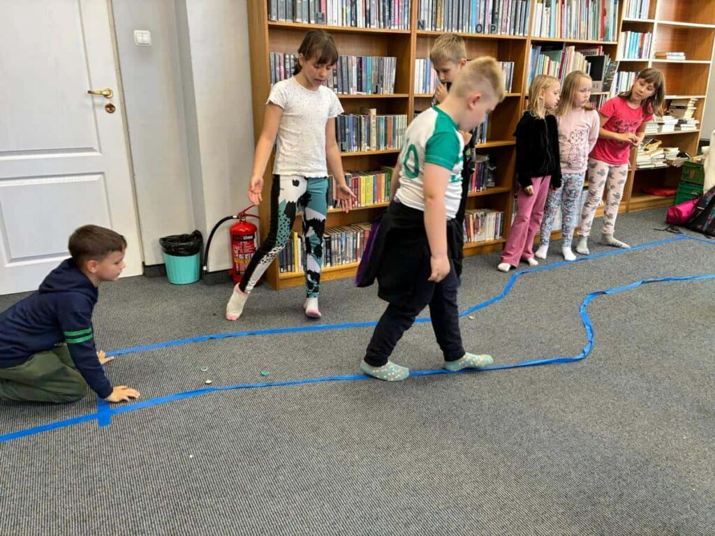 To popołudnie było prawdziwą podróżą w czasie. Na bibliotecznej podłodze zagościły klasyczne gry podwórkowe – pełne emocji, śmiechu i rywalizacji. Dzieci mierzyły się w dobrze znanych zabawach, które kiedyś wypełniały szkolne przerwy i osiedlowe podwórka. Była ciuciubabka, w której zwyciężał nie ten, kto najlepiej biegał, lecz ten, kto potrafił słuchać. Była też gra w szczura – szybka, nieprzewidywalna, z mnóstwem śmiechu i zaskoczeń. A emocje sięgnęły zenitu, gdy do akcji wkroczyła parząca piłka, wymagająca refleksu i zimnej krwi.
