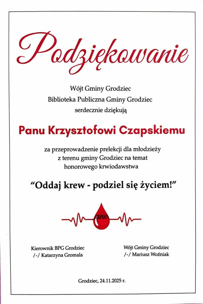 Podczas spotkań padły również słowa wdzięczności. Członkowie Klubu HDK PCK dziękowali wójtowi Grodźca Mariuszowi Woźniakowi oraz kierownik Gminnej Biblioteki Publicznej Katarzynie Gromali — to z ich inicjatywy doszło do zorganizowania całego cyklu spotkań. Podziękowania skierowano także do dyrektorów szkół oraz wychowawców, którzy aktywnie wsparli przedsięwzięcie i umożliwili przeprowadzenie prelekcji.