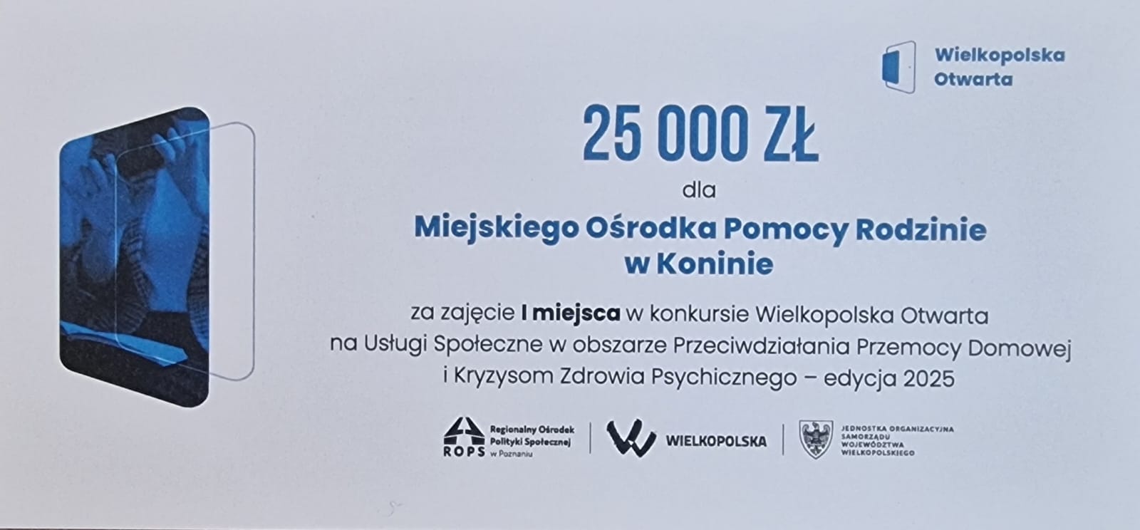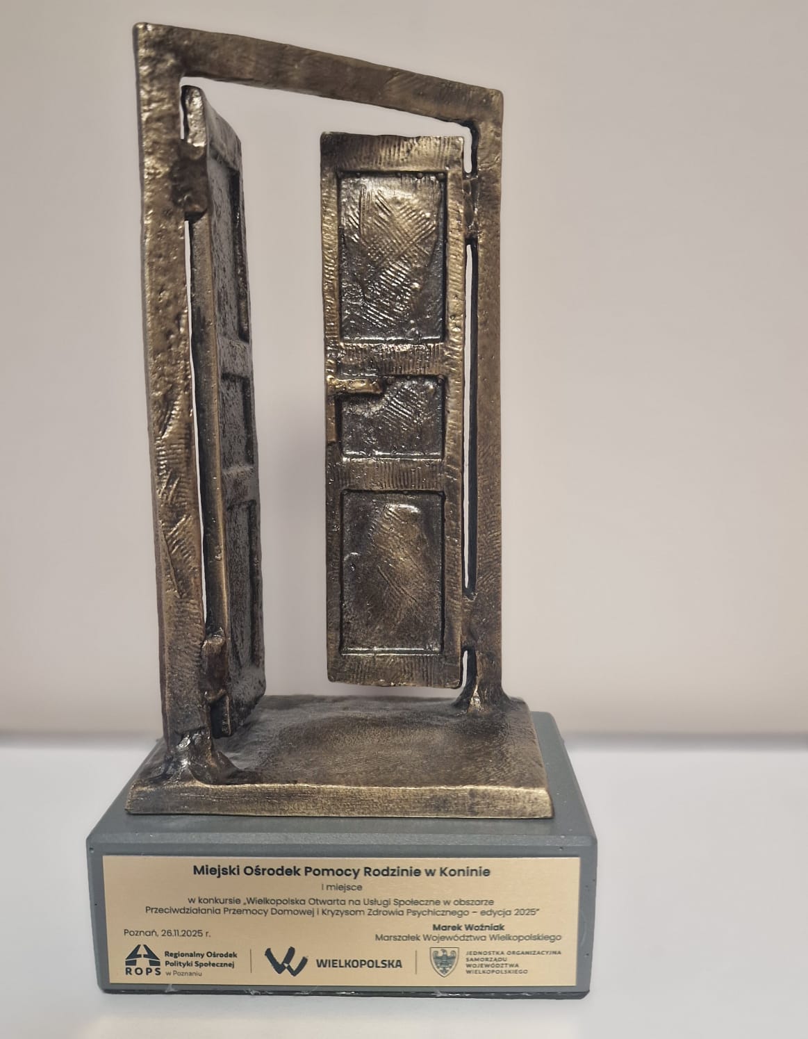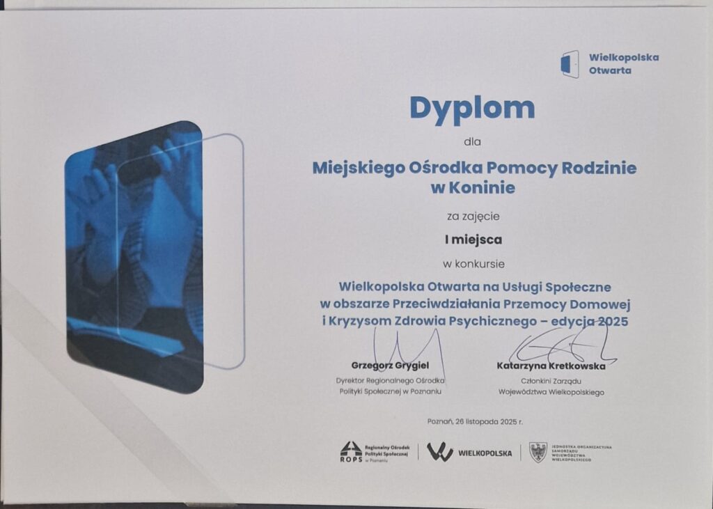 Miejski Ośrodek Pomocy Rodzinie w Koninie odniósł znaczący sukces na szczeblu wojewódzkim. Podczas uroczystej gali zorganizowanej 26 listopada w ramach obchodów Wielkopolskiego Dnia Pracownika Socjalnego, instytucja zdobyła pierwsze miejsce w kategorii Przeciwdziałanie Przemocy Domowej i Kryzysom Zdrowia Psychicznego w konkursie „Wielkopolska Otwarta na Usługi Społeczne – edycja 2025”.