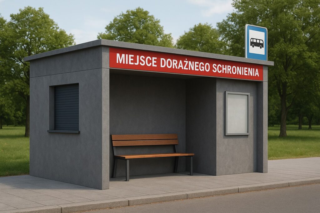 Obiekt będzie zgodny z najnowszym rozporządzeniem Ministra Spraw Wewnętrznych i Administracji z 9 lipca 2025 r., określającym standardy dla miejsc doraźnego schronienia. Na ścianach pojawi się oznakowanie „MIEJSCE DORAŹNEGO SCHRONIENIA”, a dach zostanie przystosowany do bezpiecznego odprowadzania wody opadowej.