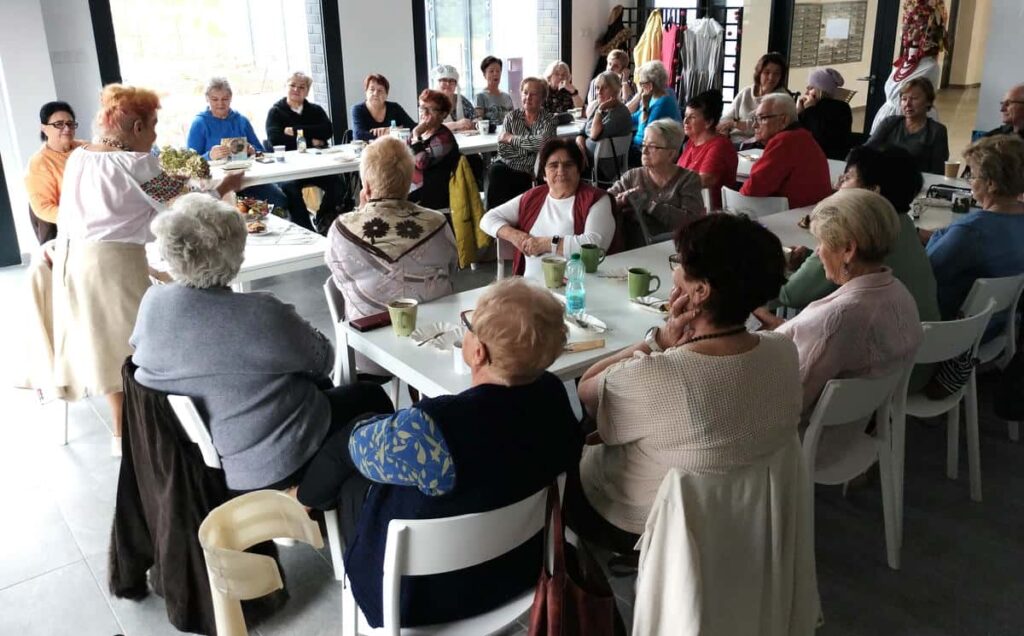 A tego dnia było gwarno bo aż zabrakło krzeseł! Na spotkanie z panią Marianną przybyło bowiem ponad 40 seniorów! Była kawka, czaj i pyszny sernik zrobiony przez naszą niezastąpiona panią Jolę.