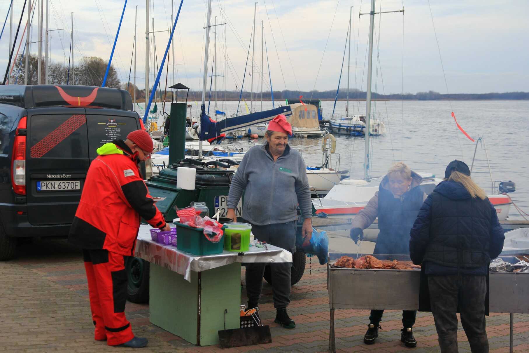 Na brzegu czekała tradycyjna, gorąca żeglarska kuchnia – grochówka, karkówka z grilla oraz gorące napoje, które rozgrzewały po powrocie na ląd.