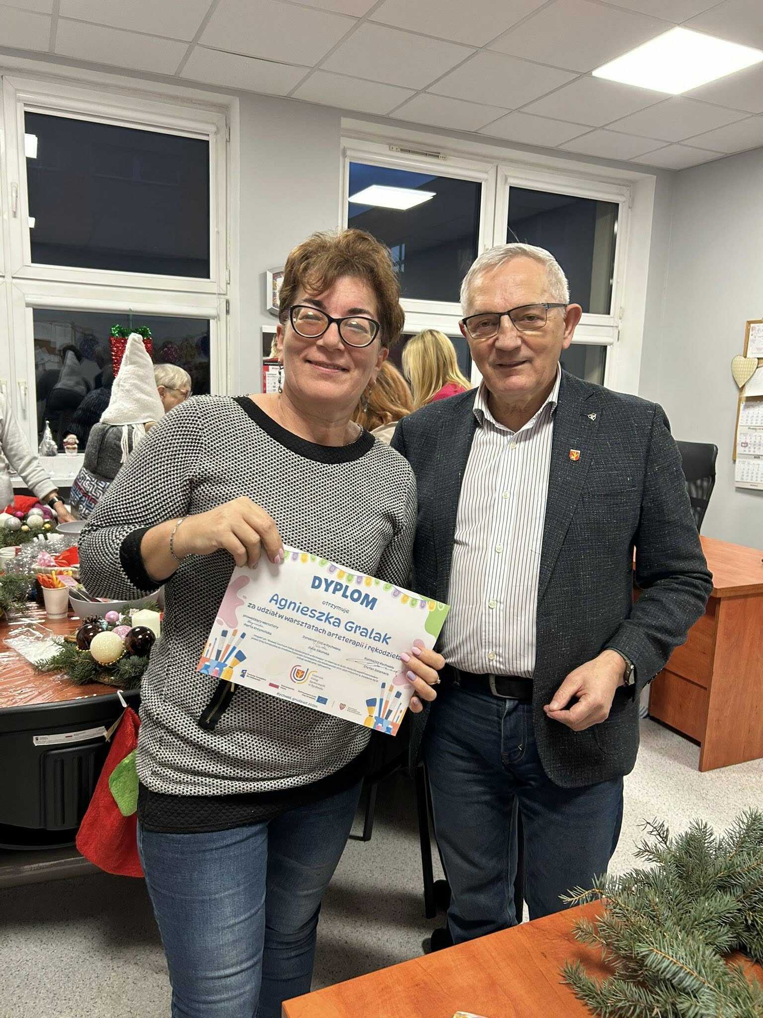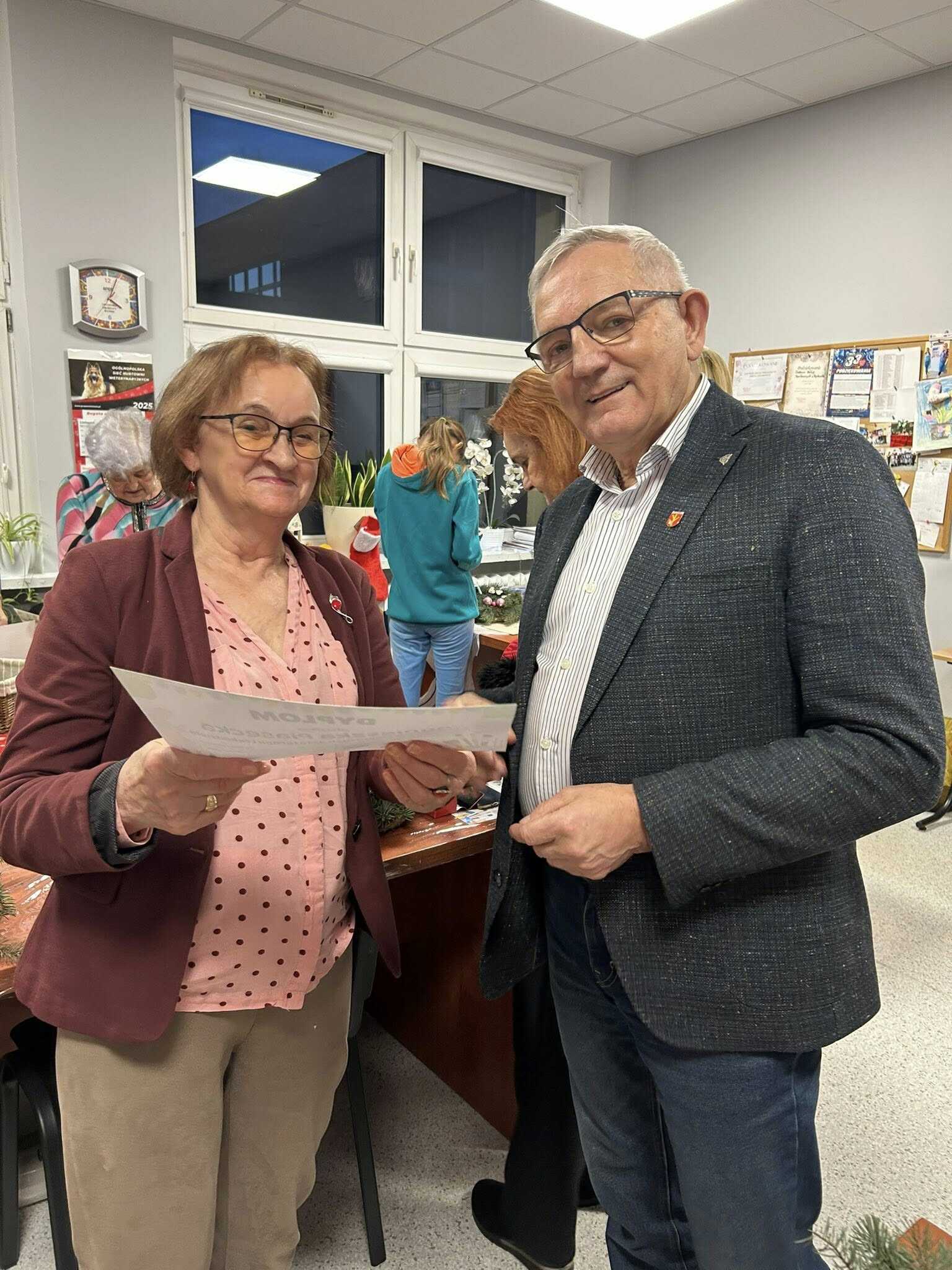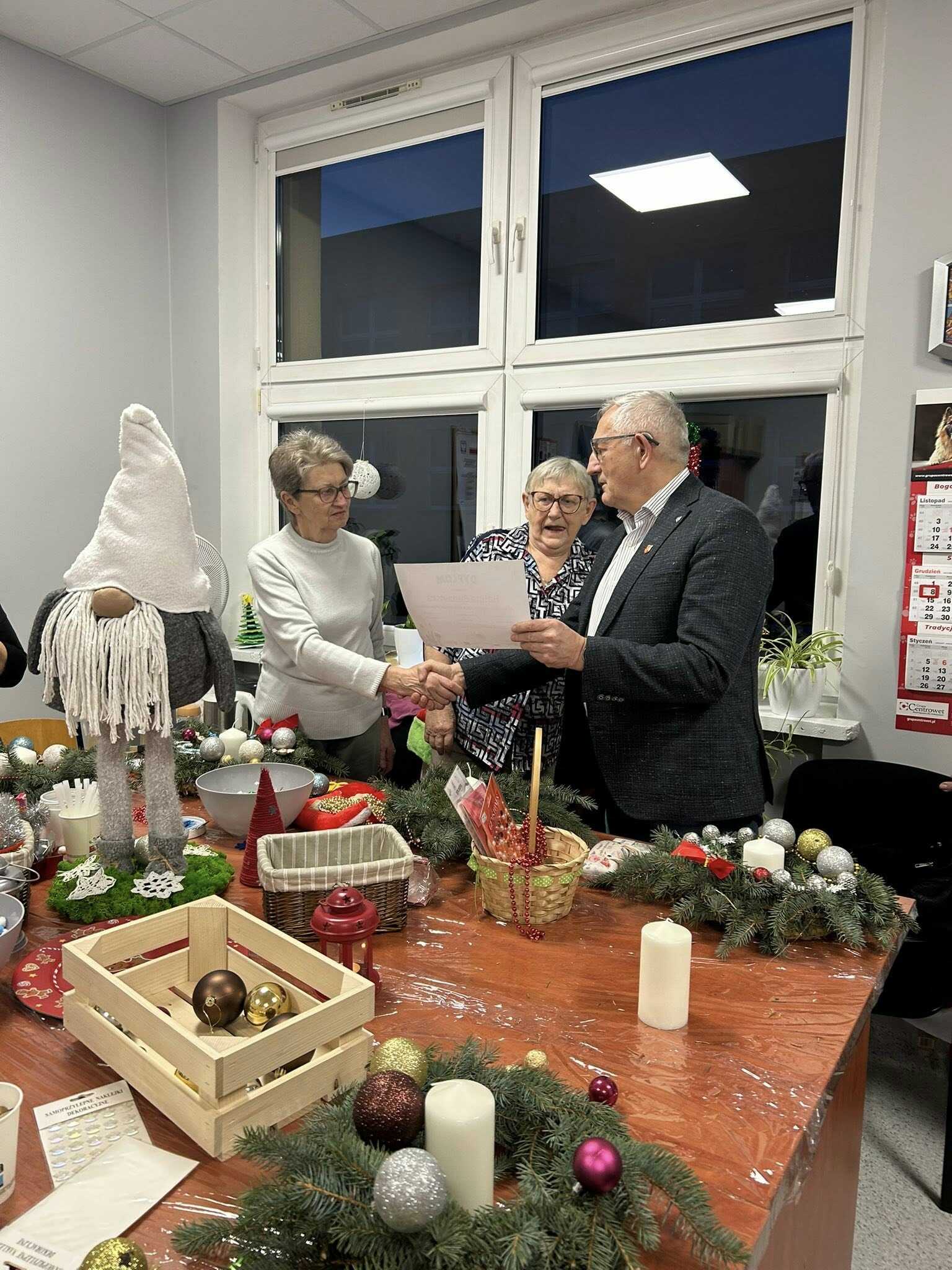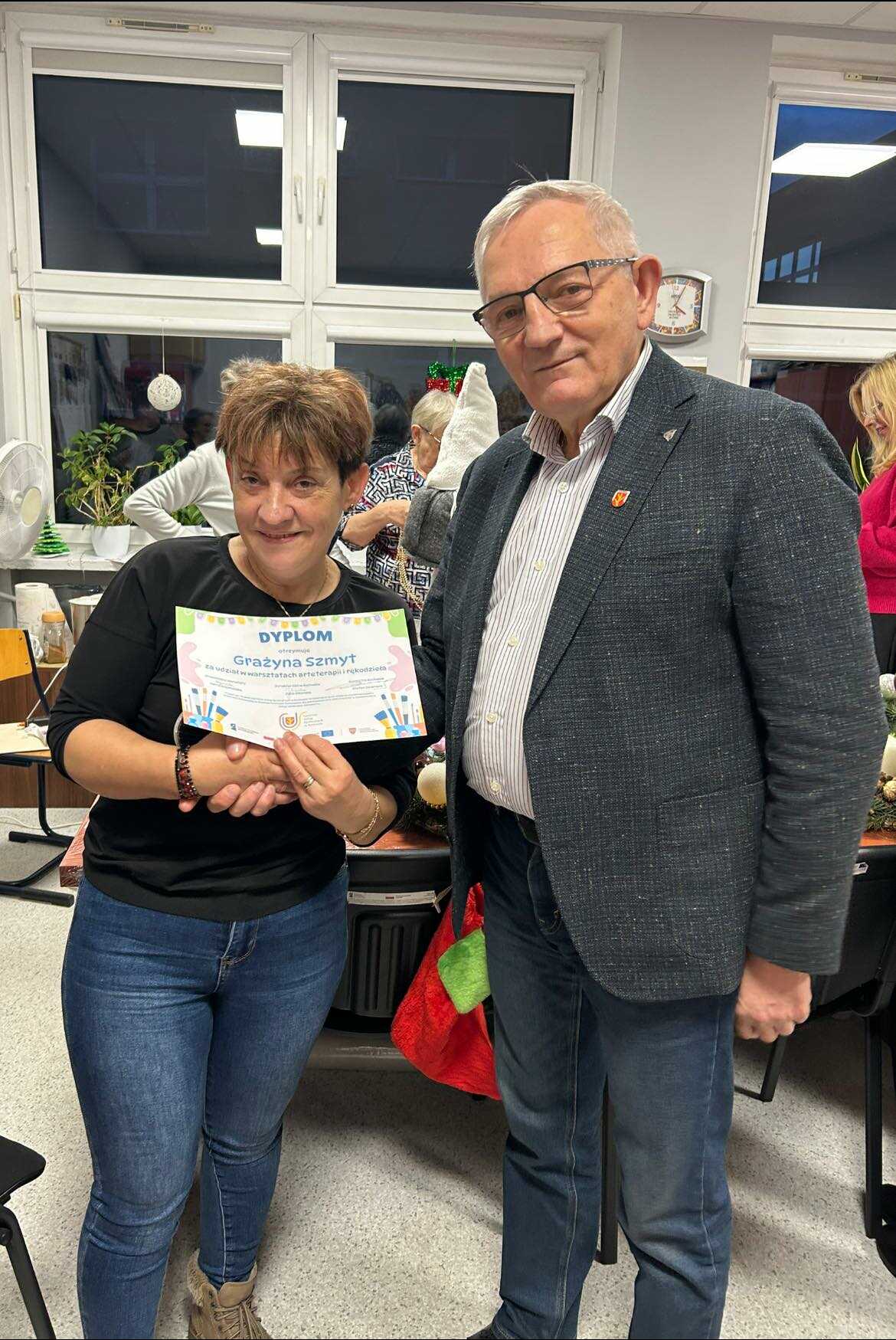 Świąteczne spotkanie zamykające zajęcia pierwszej grupy miało wyjątkową oprawę. Uczestników odwiedzili Burmistrz Rychwała Stefan Dziamara oraz jego zastępczyni Ewa Jędrzejczak. Władze gminy osobiście wręczyły dyplomy i podziękowania, podkreślając, że rozwój usług społecznych jest jednym z priorytetów samorządu.