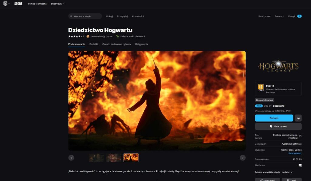To ogromna gratka dla miłośników uniwersum Harry’ego Pottera oraz graczy RPG. Epic Games Store, popularna platforma dystrybucji cyfrowej na PC, w ramach swojej świątecznej kampanii rozdaje Hogwarts Legacy bez żadnych opłat. To część corocznej tradycji darmowych gier, jednak nigdy wcześniej tak duży, wysokobudżetowy tytuł nie był oferowany „na zawsze” w ramach jednorazowej promocji.