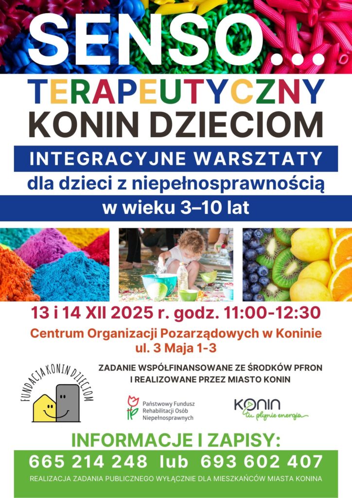 Fundacja Konin Dzieciom zaprasza najmłodszych mieszkańców miasta do wyjątkowej, wielozmysłowej podróży. Już 13 i 14 grudnia w Centrum Organizacji Pozarządowych odbędą się weekendowe warsztaty o charakterze integracyjnym, przygotowane specjalnie dla dzieci z niepełnosprawnością w wieku 3–10 lat oraz ich rodziców. To propozycja, która łączy edukację, zabawę i terapeutyczne działanie – wszystko w atmosferze grudniowej magii.