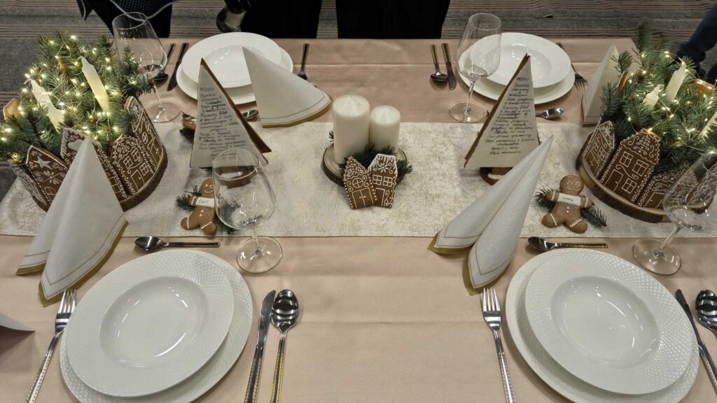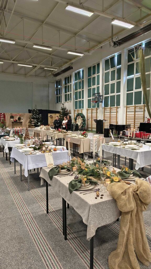 Motywem przewodnim wojewódzkiego konkursu stołów były w tym roku „Piernikowe święta od kuchni”. Uczniowie zaprezentowali niezwykle dopracowane kompozycje, w których dominowały naturalne elementy – igliwie, świąteczne dodatki oraz misternie wykonane dekoracje z piernika. Stoły zachwycały estetyką, pomysłowością i dbałością o detale, przyciągając uwagę zarówno jurorów, jak i licznie zgromadzonej publiczności.