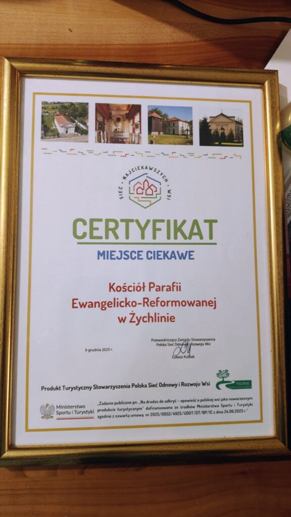 Parafia Ewangelicko-Reformowana w Żychlinie – jedno z najbardziej niezwykłych i jednocześnie najmniej znanych miejsc na mapie wielkopolskiego dziedzictwa – otrzymała prestiżowy certyfikat „Miejsca Ciekawego” jako Produkt Turystyczny Stowarzyszenia Polska Sieć Odnowy i Rozwoju Wsi. To kolejny, wyjątkowy powód, by ponownie spojrzeć na Żychlin jako na przestrzeń, w której historia reformacji wciąż jest żywa, a lokalne dziedzictwo nabiera nowego znaczenia.